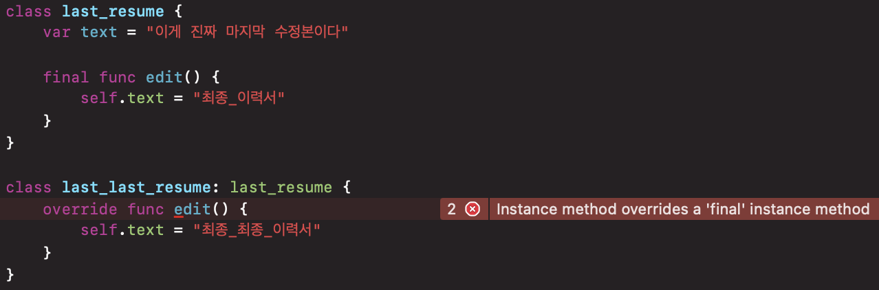 Swift 에서는 다른 언어와 비슷하게 클래스를 상속해 서브클래스를 구현할 수 있어요. 만약, 해당 클래스가 더이상 상속이 필요없거나 특정 속성은 오버라이드하지 않아야 한다면 어떻게 해야할
