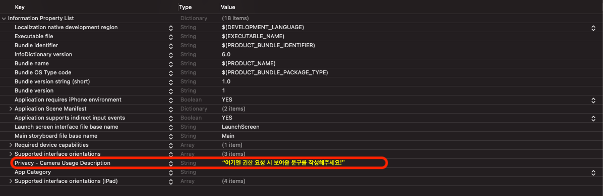 프로젝트의 Info.plist에 Privacy - Camera Usage Description 을 추가하여 앱 실행 시 권한을 요청합니다 .